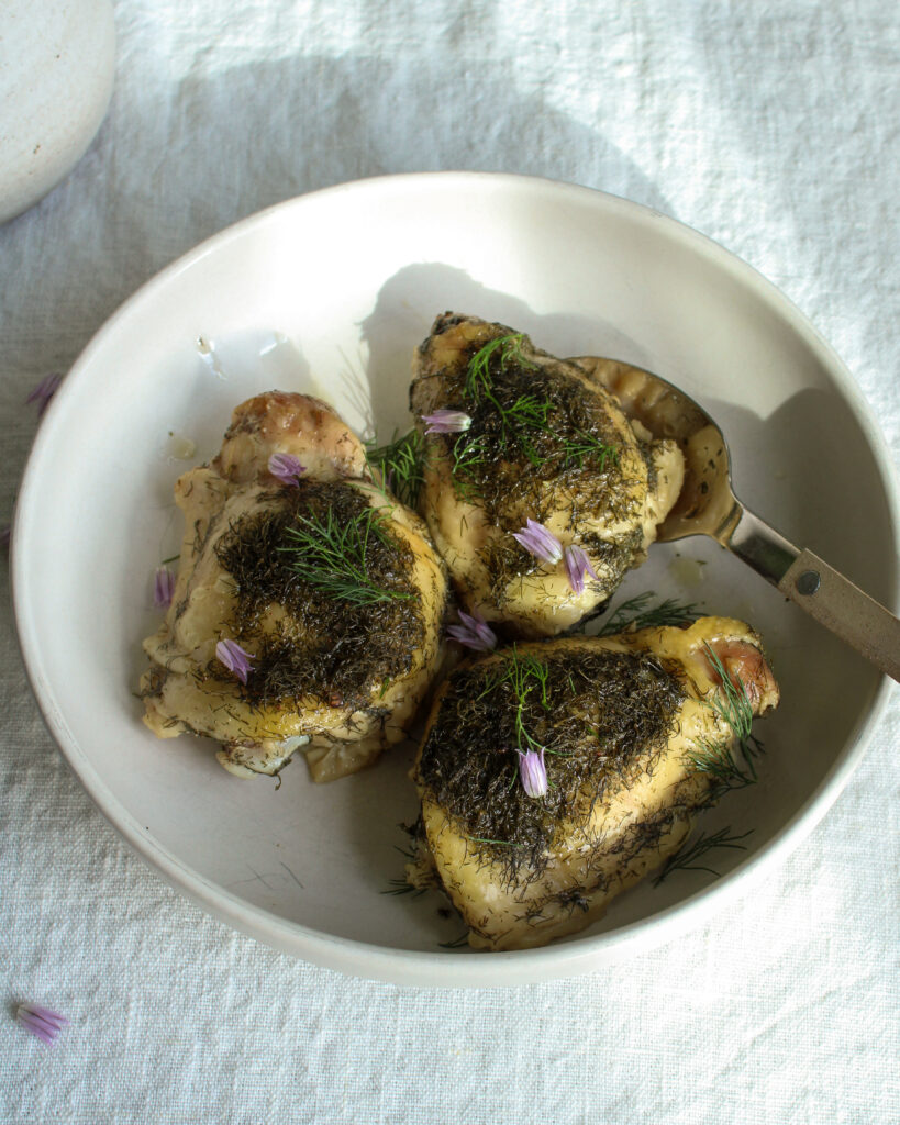 Dutch Oven Dill Chicken This recipe is so easy and so good—it’s my go to chicken dinner. The chicken comes out incredibly tender and juicy. With minimal ingredients and hands-on time, it’s an easy meal for any night. Using high-quality meat from pasture raised chickens significantly improves the tenderness and flavor of this slow-cooked chicken.